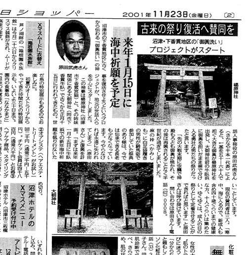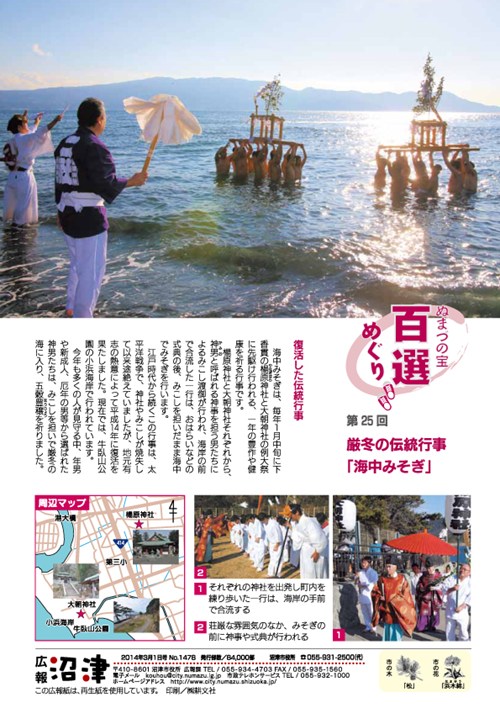| 内 容 | ・参加者紹介(2分) ・厳冬海中みそぎ祭り概要(3分) ・当日の流れ、神男の動き、持ち物、質疑応答(40分) ・参加者個々の入り時間確認、前泊、当日泊(15分) ・神男の決意表明 ・前泊者で、夕食できる方は16時頃沼津駅、16:50弥次喜多集合 |